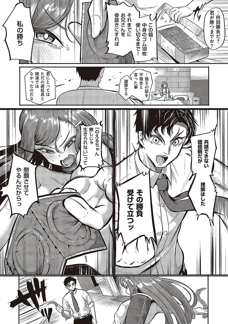 >この結果が腑に落ちないのえるは、「ゴム100枚使い切るまでにお兄さんを骨抜きにする」と彼に勝負を挑む!!